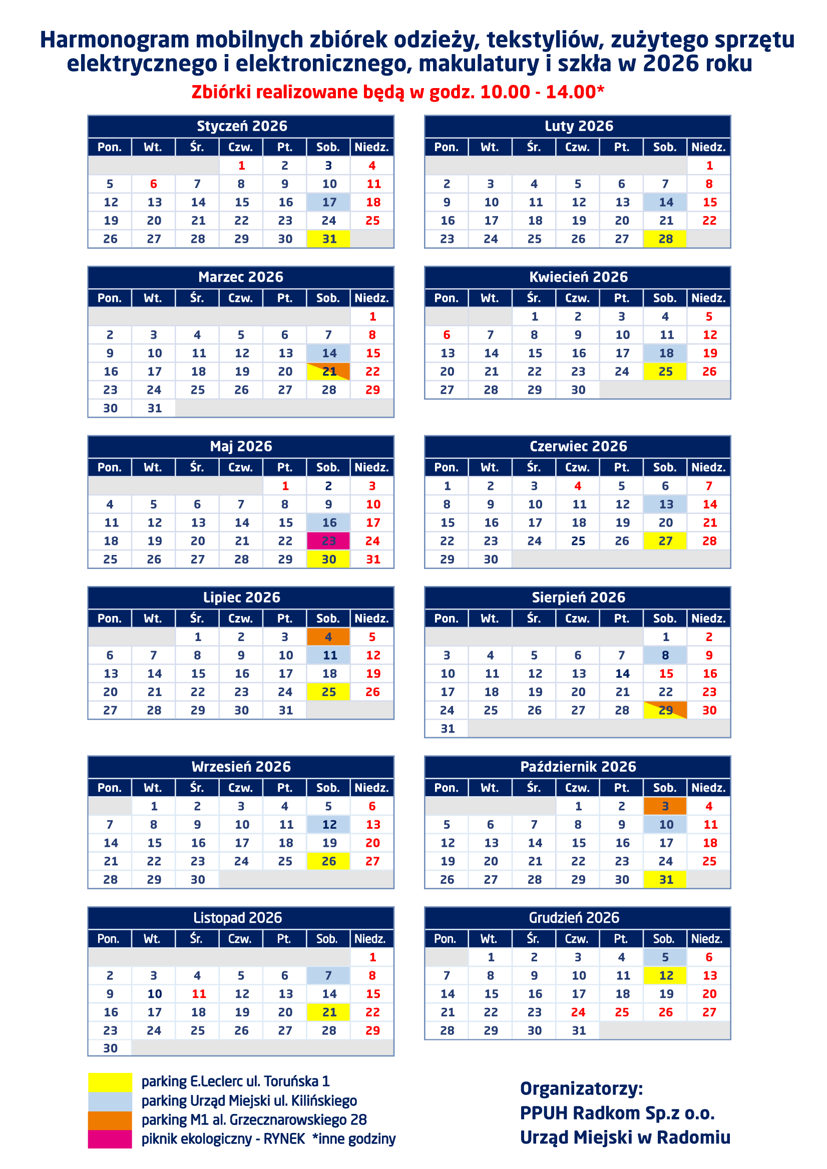 Harmonogram zbiórek na cały rok dostępny jest pod adresem: https://www.radom.pl/dla-mieszkancow/sprawy-spoleczne/gospodarowanie-odpadami-komunalnymi/mobilne-zbiorki-odpadow-komunalnych/2026-2/