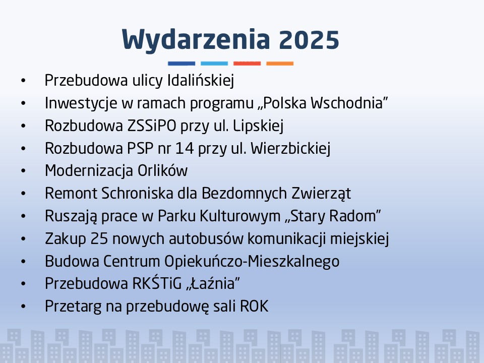 W 2025 roku miasto przeznaczyło na inwestycje 400 milionów złotych. Wśród największych projektów znalazły się m.in. budowa nowego wiaduktu w ciągu ulic Żeromskiego i Lubelskiej, trzeciego odcinka trasy N-S, przebudowa ulicy Wolanowskiej, a także program „Miasto Przyjaznych Zmian”. Został również wybudowany nowy blok z mieszkaniami na wynajem przy ul. Piastowskiej, a stadion przy ul. Struga 63 powiększył się o dwie trybuny – wschodnią i zachodnią.