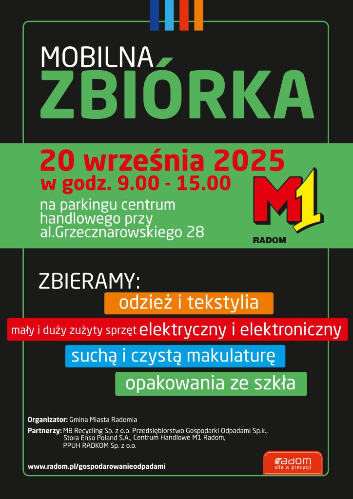 W dniu 20 września 2025 r. w godz. 9:00 – 15.00 na terenie Centrum Handlowego M1 Radom odbyła się mobilna zbiórka odpadów surowcowych. Radomianie tego dnia mogli w bezpieczny sposób pozbyć się zalegającej w domach: odzieży i tekstyliów, makulatury, szkła oraz zużytego sprzętu elektrycznego i elektronicznego.