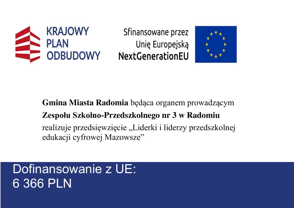 Gmina Miasta Radomia będąca organem prowadzącym  Zespołu Szkolno-Przedszkolnego nr 3 w Radomiu, otrzymała grant zgodnie z Umową o powierzenie grantu: nr 70/LILPEC-M w wysokości 6 366,00 zł na zakup cyfrowych materiałów dydaktycznych w ramach Projektu  „Liderki i liderzy przedszkolnej edukacji cyfrowej” realizowanego przez Fundację „Robisz to”, finansowanego ze środków UE – Instrumentu na Rzecz Odbudowy i Zwiększania Odporności, w ramach Krajowego Planu Odbudowy – Reforma: C2.1: Zwiększenie skali zastosowań rozwiązań cyfrowych w sferze publicznej, gospodarce i społeczeństwie, Inwestycja C2.1.3: E-kompetencje.